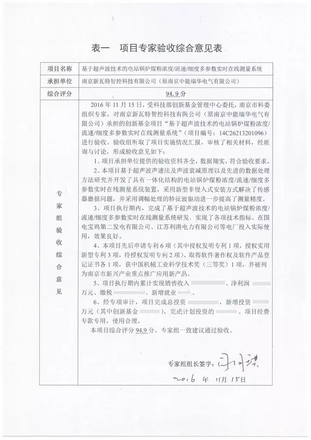 南京瓦特智控于2014年承接科技部技术创新基金项目《基于超声波技术的电站锅炉煤粉浓度/流速/细度多参数实时在线测量系统》,面向电站锅炉燃烧运行所需的煤粉气固两相流动关键状态参数的实时在线检测这一行业前沿课题和传统难题,通过公司全体项目组同仁历时两年的卓有成效的持续研发创新和现场应用实践工作,目前系统各项主要技术经济指标均已达到或超过项目要求。2016年11月15日科技部委托江苏省科技厅、南京市科委组织专家组在宁举办项目验收会议,项目成功通过验收。